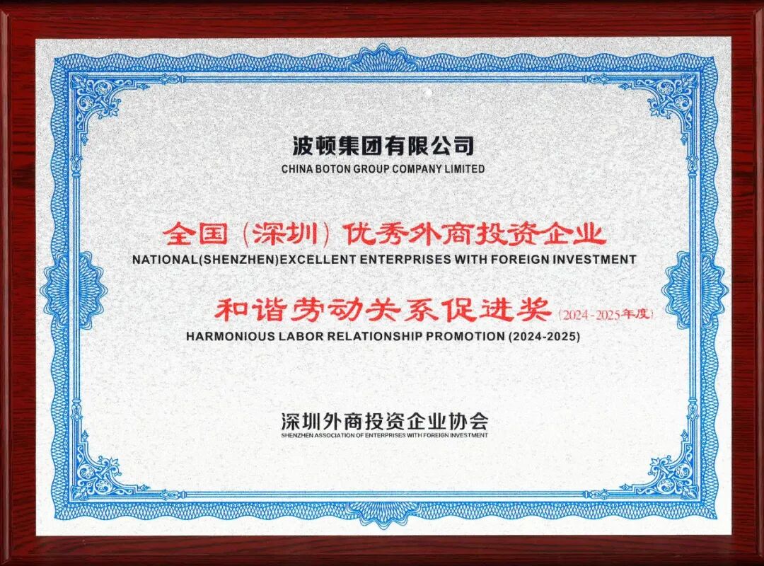 2025年12月16日,2025年全國(深圳)優秀外商投資企業表彰大會暨深圳市外商投資企業優秀管理者表彰大會在深圳前海國際會議中心舉行。波頓集團榮獲2025年全國(深圳)優秀外商投資企業“雙優企業獎”、“和諧勞動關系促進獎”、“合規建設促進獎”和“綠色減碳促進獎”等稱號。